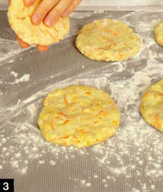 2 . Растопите сливочное масло и слегка остудите. Смешайте сливочный сыр с молоком и сахаром, добавьте 2 ст. ложки растопленного масла. Переложите эту смесь к муке с сыром и морковью и быстро замесите тесто. Не вымешивайте тесто долго, иначе лепешки будут жесткими.