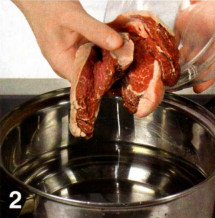 3 . Теплое мясо наржьте кусками длиной примерно 2,5-3 см. В кастрюле с толстым дном разогреть половину сливочного масла и обжарить в нем куски баранины, по 2-3 минуты с каждой стороны.