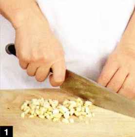 1 . Залейте миндаль кипящей водой и оставьте на 5 минут. Снимите кожицу и обсушите. Крупно порубите орехи ножом.
