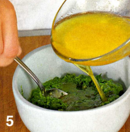 5 . Постоянно размешивая, влить растопленное масло в зелень с чесноком. Приправить солью и перцем по вкусу