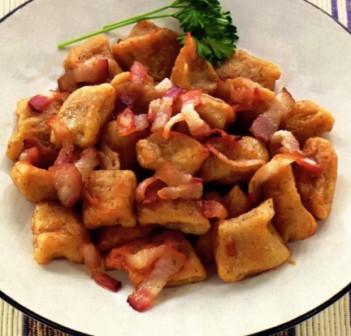 3 . Растопить масло в большой сковороде, обжарьте клецки до золотистого цвета, 2-3 минут. Приправьте солью и перцем. Подавайте со сметаной, обжаренным беконом или растопленным маслом.
