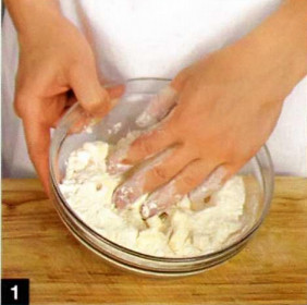 до 190 °С. Приготовьте тесто. Смешайте муку, сахар, разрыхлитель и соль в большой миске. Сливочное масло нарежьте кубиками и добавьте в миску. Кончиками пальцев разотрите масло с мучной смесью, пока не образуется крупная крошка размером с горошину. Добавьте сметану и быстро перемешайте. Если вымешивать долго, тесто станет жестким.