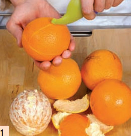 1 . Один апельсин отложите. Остальные очистите от кожуры с помощью специальной апельсиночистки. Для этого острым концом приспособления сделайте на плодах вертикальные надрезы, перевернуть апельсиночистку, поддеть закругленным концом кожуру и снимите ее.