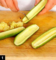1 . Разрежьте огурцы пополам вдоль и ложкой удалите семена, если они крупные. Половинки огурцов разрежьте еще раз вдоль пополам, а получившиеся четвертинки - кусочками толщиной 1 см. Положите в дуршла, посыпьте солью и оставьте на 30 миун.