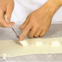 2 . Муку просеять с солью. Добавьте воду, сливочное масло и сметану. Хорошо вымесьте тесто. Накройте пленкой и оставьте на 10 минут в теплом месте. Тесто разделейте на 3 части. 2 части накройте пленкой. Оставшуюся раскатайте в длинную ленту шириной 9 см. Разложите по центру по 2 ст. ложки начинки на расстоянии 3 см друот друга. Края смажте водой. Сложите пласт вдвое.